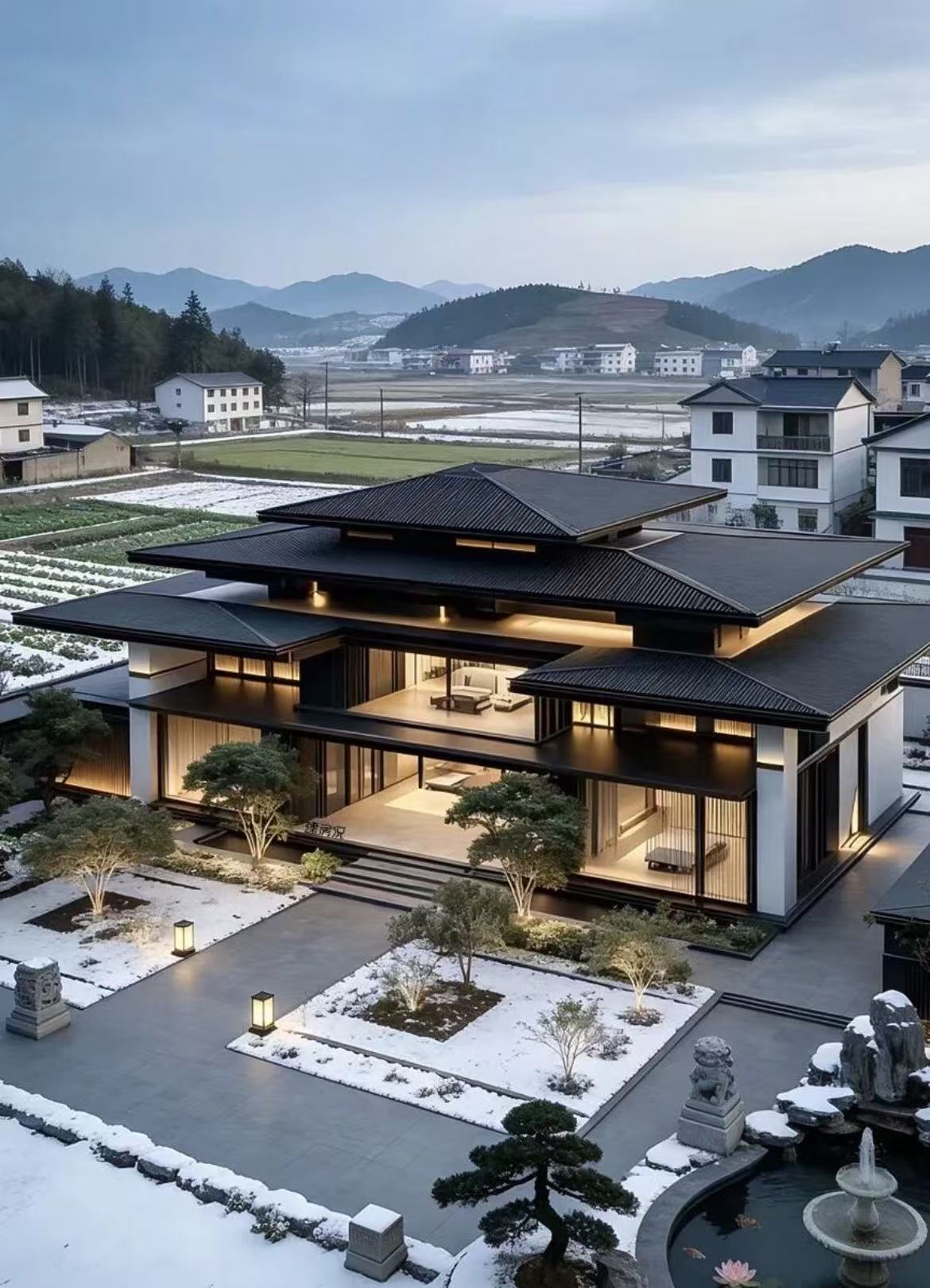 - 层次丰富的屋顶:多层退台的屋顶设计,既还原了宋式建筑的舒展感,又解决了现代别墅的采光、排水需求。